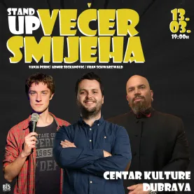 Kultura Večer smijeha uz BIS comedy Petak, 13. ožujka u 19:00Mala dvorana, Kulturni centar Dubrava (Dubrava 51a) Večer smijeha Pripremite se... 12. veljače 2026.