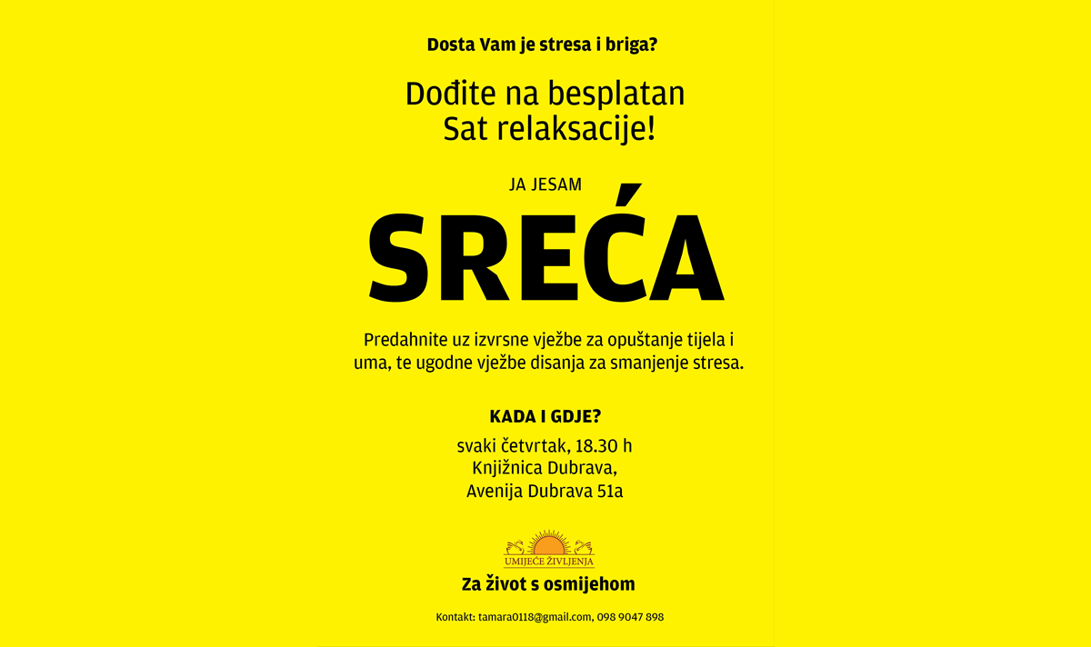 Arhiva Sat relaksacije Besplatni sat relaksacije održava se u suradnji Knjižnice Dubrava i Udruge Umijeće življenja Hrvatska,  projekt... 17. travnja 2014.