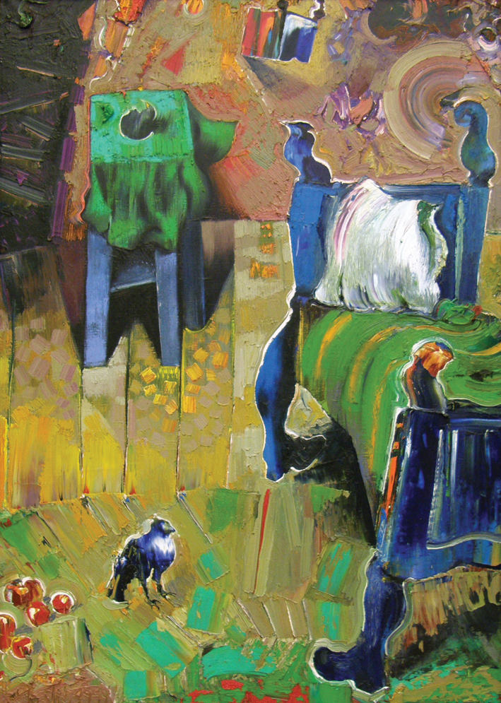 Tamo gdje se učvršćuje stvarnost prizora izbija fantastično, a kroz geometrijsku “shemu” stola, stolice, ladice, sobe, stubišta, okomice ili horizontale zidne plohe, silovita slikareva imaginacija rastvara ih u krivulje crtovlja i vrtložne kolorističke proplamsaje boje, u pričine i fantazmagorične prizore, u mitološke i nadrealne scene, u ludičke “zapise” svoga osebujnoga likovnoga svijeta.