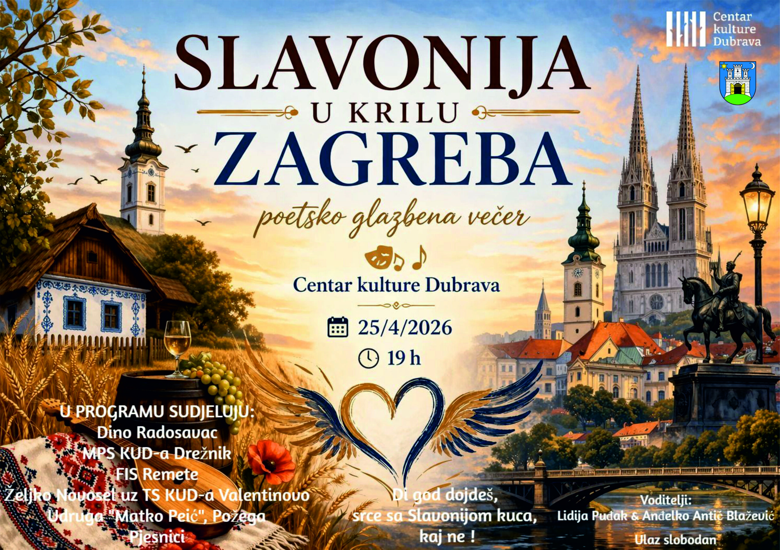 U subotu, 25. travnja 2026. godine s početkom u 19 sati, u Centru kulture Dubrava održat će se 14. po redu  poetsko glazbena manifestacija „Slavonija u krilu Zagreba“, koja datira još od 2013. godine, okupljajući zaljubljenike u riječ, pjesmu i baštinu, njegujući susret Slavonije i Zagreba, ikavice i kajkavštine, u duhu zajedništva i iskrene emocije.