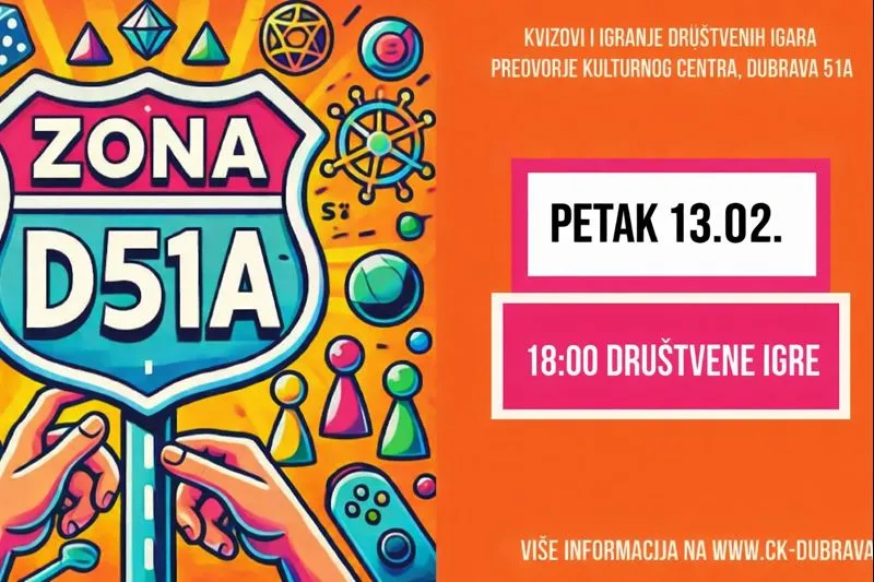 Kultura Zona D51a – društvene igre Pozivamo vas na još jedno druženje uz društvene igre u sklopu programa Zona D51a. Program... 2. veljače 2026.