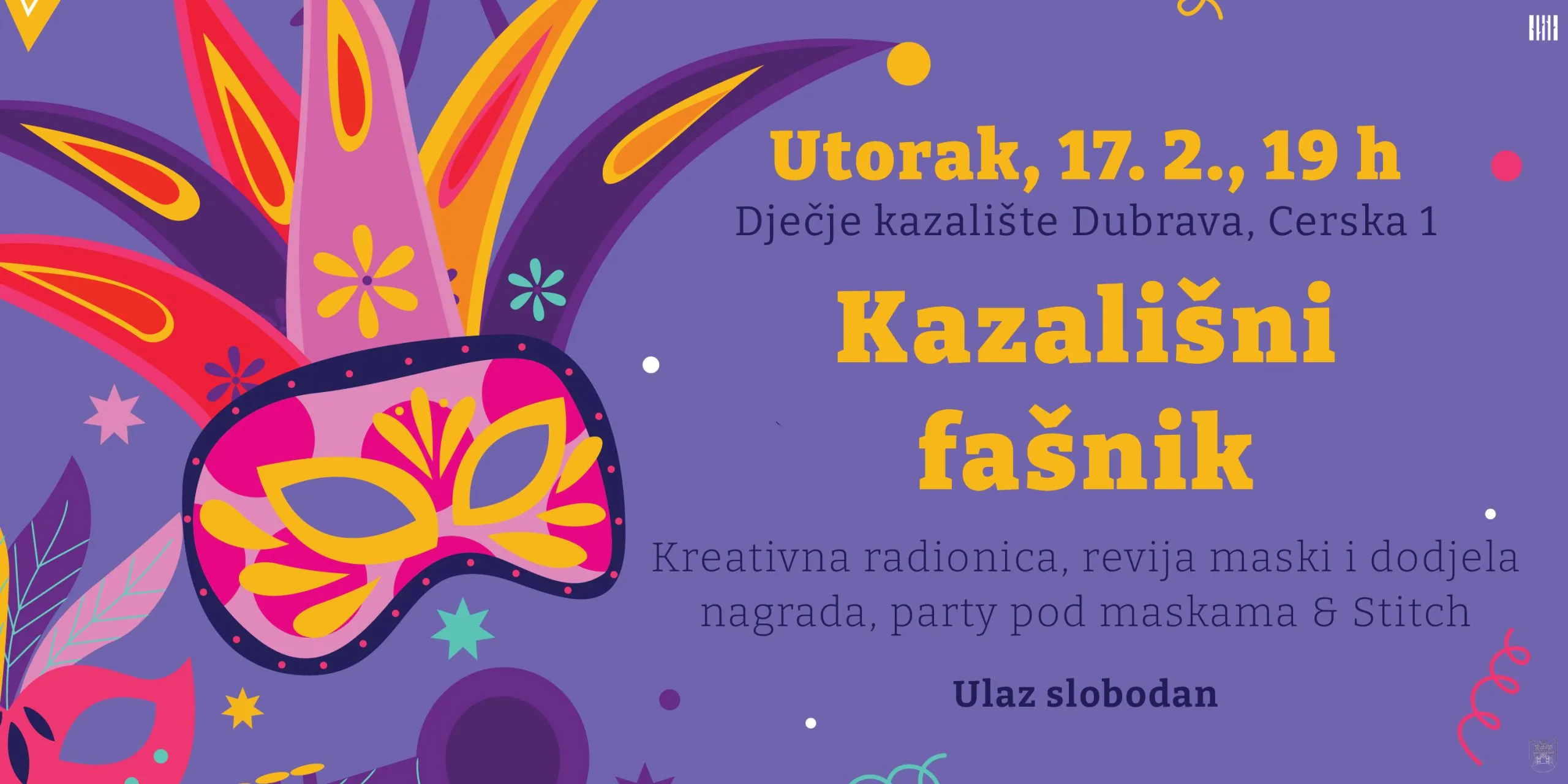 Kultura Kazališni fašnik u Dječjem kazalištu Dubrava U utorak, 17. veljače, Dječje kazalište Dubrava u Cerskoj 1 otvara vrata jednoj posebnoj fašničkoj... 6. veljače 2026.