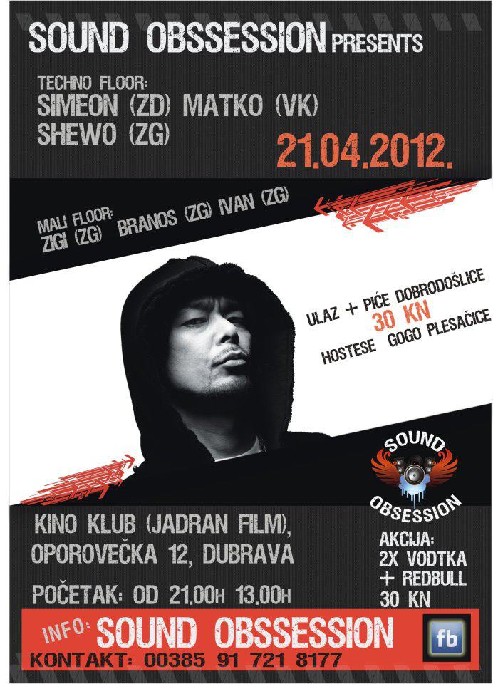 Arhiva Sound obssession predstavlja u Kino klubu u sklopu Jadran filma u subotu  21.04.2012. održava se Techno party, upad... 20. travnja 2012.